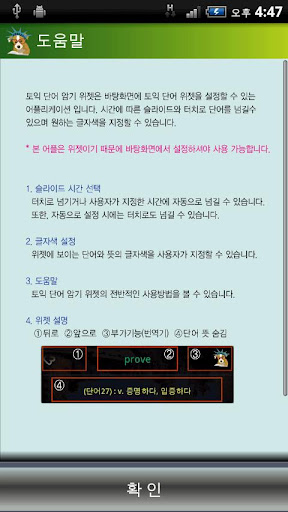 토익 단어 슬라이드 위젯은 바탕화면에 토익 단어 위젯을 설정할 수 있는 어플리케이션 입니다. 시간에 따른 슬라이드와 터치로 단어를 넘길수 있으며 원하는 글자색을 지정할 수 있습니다. 슬라이드 타이머를 짧게 지정할 경우 깜빡이 기능으로도 사용 가능하며, 부가 기능으로 미니 번역기가 내장 되어 간단한 문장을 영어로 만들거나 한국어로 번역할 수 있습니다. 주기적으로 업데이트 될 예정입니다. 많이 이용해주세요.^^