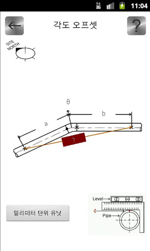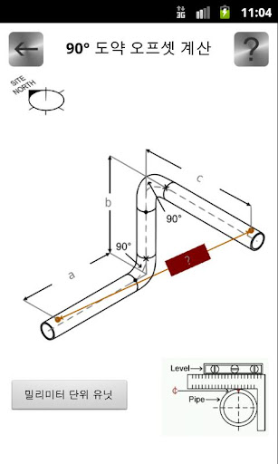 파이프 연결을 위한 각도와 A,B 값을 입력하면 어플리케이션은 입력된 두 지점 사이를 계산합니다.