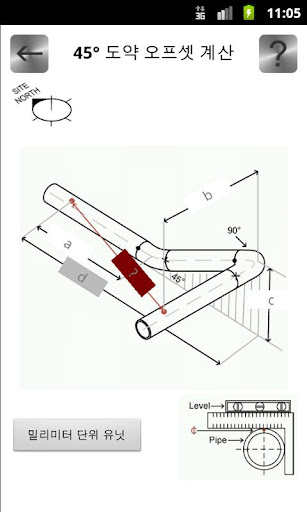 본 어플리케이션은 작업장의 파이프 오프셋 수치 측정과 동일한 방법을 사용하며 사용자는 복잡한 계산 방식을 몰라도 버튼을 누르기만 됩니다. 간단히 필요한 데이터를 입력하면 나머지는 어플리케이션이 자동으로 계산해 줄 것입니다.