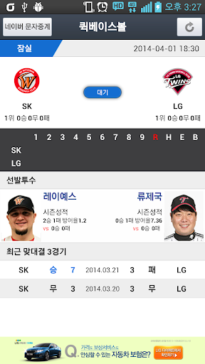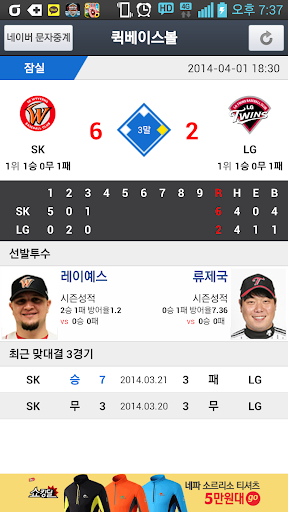 - 스코어 보드 (베이스 주자 정보, 선발투수, 팀방어율, 팀타율, 팀홈런, 상대전적, 최근 3경기 상대전적, 네이버 문자중계링크)