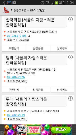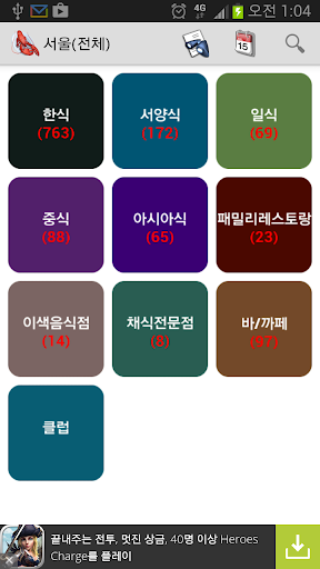 - 한식 / 일식 / 중식 / 채식 / 이색음식점 / 바/까페 / 클럽 / 서양식 / 아시아식 등의 카테고리가 존재한다.