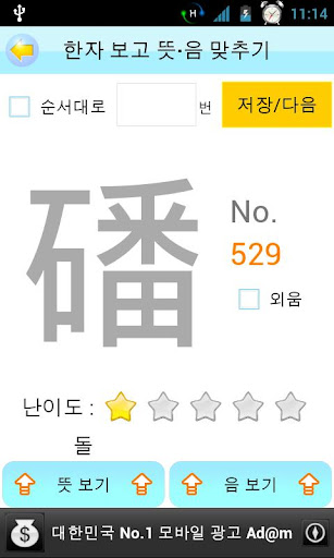공통적으로 각 메뉴 안에서 [저장/다음] 버튼을 누르면 무작위 한자가 나타나고 왼쪽 상단 순서대로 체크를 하면 현재 한자 번호부터 순서대로 한자가 보여집니다. 직접 번호를 입력하여 해당 한자로 이동할 수도 있습니다.