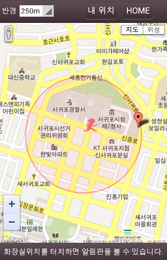 화장실 위치와 이름을 확인 할 수 있으며 반경에 따라 더 많은 화장실도