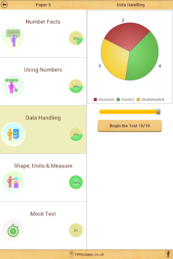 An interactive pie chart displays current progress for each topic. You can touch the different color slices of the pie and choose if you wish to answer only incorrectly answered questions, unattempted or correctly answered questions. This feature is very useful to achieve 100% score in each topic.