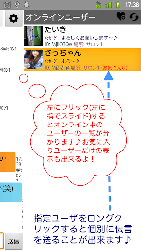 - オンライン中のユーザー一覧を確認し、伝言やプロフ画像を投稿/確認出来ます♪