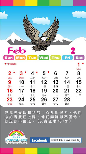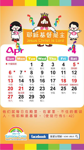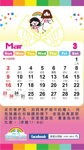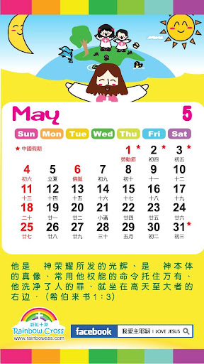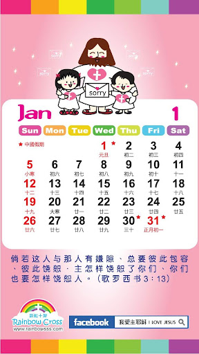 彩虹十架为推广基督教福音而设计这个年历,希望让大众多方面得益及认识上帝丶主耶稣,以及生命和真理。