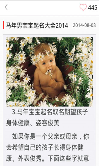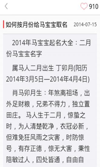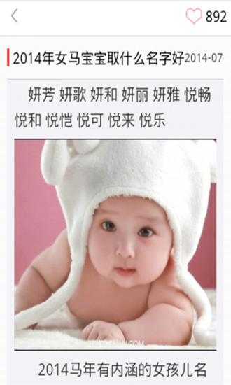 2014很多马宝宝出生,怎样给马宝宝取名字呢?来看一下2014马年宝宝起名大全吧,提供海量属马的男宝宝名字、女宝宝名字。正所谓人如其名,好名受用一生,爸爸妈妈们快来为你的马宝宝取个吉祥如意的好名字吧。
