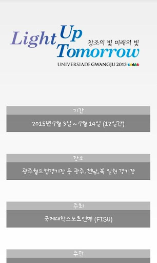 이 작품은 2015광주 유니버시아드에 대한 정보 및 관광정보를 알리고 미니게임을 통해 스포츠를 접해봄으로써 여러부류의 세대층이 쉽게 이 어플리케이션을 접근할 수 있도록 기획해보았다. 이 작품은 어느 누구나 쉽게 사용할 수 있다는 것입니다. 이 어플리케이션을 만들면서 초등학생들도 어떻게 하면 쉽게 이 어플리케이션을 접근할 수 있을까 생각을 해봤다. 누구나 한번쯤은 해봤을 카카오톡과 비슷한 메뉴텝을 구성하여서 다른 앱들보다는 쉽게 다가갈 수 있다고 생각한다. 이 어플리케이션을 만들면서 생각했던 것이 어린이부터 스마트폰이 어렵게 느껴지시는 분들까지도 편리하게 사용할 수 있게끔 생각하면서 만들어 봤다. 그래서 버튼들에서부터 이미지를 광주 유니버시아드 캐릭터를 사용하여 쉽게 알아 볼 수 있도록 구성하였다.