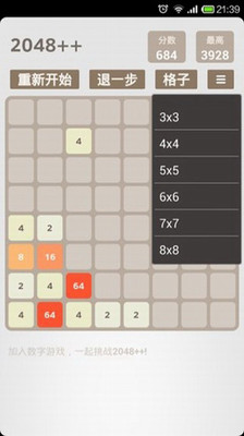 2048++ 默认是8x8 模式,同时支持选择3x3,4x4, 5x5,6x6,7x7 模式。而原版2048只有4x4 模式。