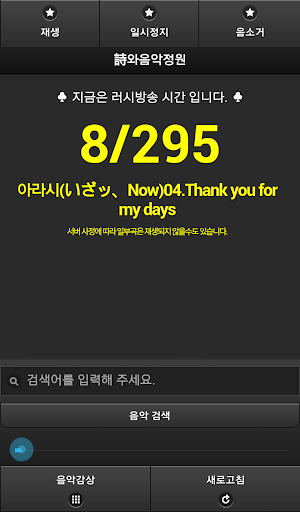 다양한 장르별로 24시간 방송 하고 있으며 러시방송 중일때는 검색 기능을 제공 합니다.