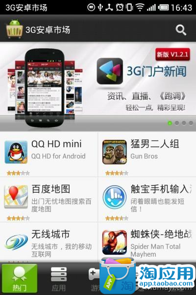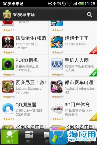3G安卓市场是一款面向Android系统开发的应用商店客户端。3G安卓市场提供近三万款精心筛选的软件和游戏,支持断点续传、双任务下载,具有强大的软件管理功能,支持云备份及批量恢复安装应用程序。 产品特性: 1. 云安装 ,强大的云安装功能,允许您备份爱机或其它机子的应用安装记录,一键备份一键安装,刷机不用怕! 2. 资源丰富 ,共24个分类近三万款热门应用与游戏,装机必备、壁纸、主题等资源应有尽有。 3. 贴心管理 ,管理功能帮您全面掌握软件的下载、安装、更新及卸载的过程,双任务同时下载也是我们的一大特色。