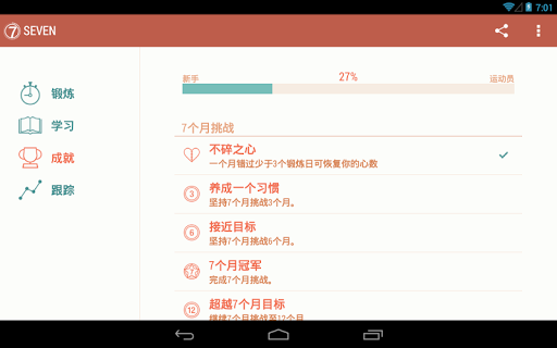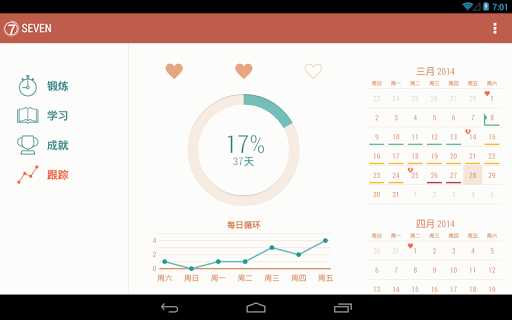 就像视频游戏一样,Seven开始有三条命。跳过一天即失去一颗心,一个月错过3次锻炼,进度将重置为零,即Game Over了!每天锻炼并坚持7个月可实现100%并成为7/7冠军。