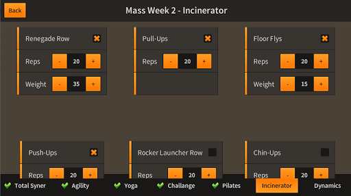 This app will save the reps and weights for each exercise. It will automatically check off each workout so you can visually see how much you have left to do.