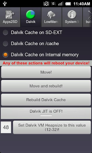 - Set Dalvik Heapsize (for now only values between 12 and 32, i do not know if any values in this margin are good!)