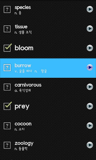 ☆ 모르는 것만 듣기 ~ 학습하면서 아는 단어를 체크하여 전체 단어, 모르는 단어 또는 아는 단어만을 반복적으로 학습하기.