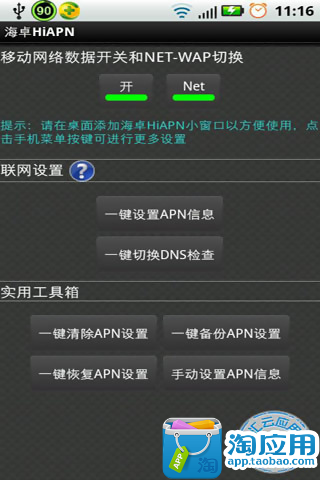 在桌面快捷切换接入点和开关GPRS的功能。同时对于刚接触 android系统的机友,提供了如“一键设置”、“一键备份”、“一键恢复”、“手动设置”等智能人性化功能。海卓HiAPN的目标是,做APN管家,上网APN设置一个软件全部搞定。