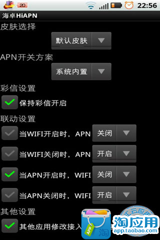 2.丰富的配置,可以配置在关闭GPRS时仍然保持彩信功能开启;可以配置开关wifi时触发GPRS的开启和关闭,或开关GPRS时触发WIFI的开启或关闭;支持机友自定义皮肤(放于SD卡),并提供不同的皮肤下载,以适应机友个性化的桌面的需要。