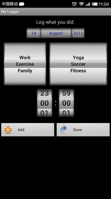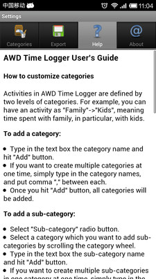 AWD Time Logger is an All-Wheel-Drive time logger for quickly logging your time in customized categories. Summary is shown in charts and list. You can also export your logs to a csv file for analysis using other applications.