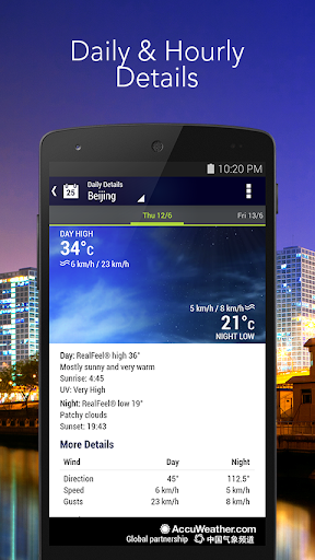 • 目前氣象情況會不斷更新最新的濕度、降雨機率、露點、能見度、紫外線指數、最大陣風風速及風向、日出及日落時間,以及 RealFeel®(AccuWeather 獨家氣象預報系統,可分析多種氣候情況來判斷當地氣溫的實際感覺)。