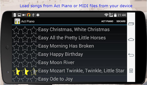 你可以在互聯網上找到你喜歡歌曲的鋼琴演奏MIDI檔(或者將你紙質樂譜輸入打譜軟體MuseScore等,再轉成MIDI檔),下載到SD卡以後就可以用ActPiano來嘗試練習了!