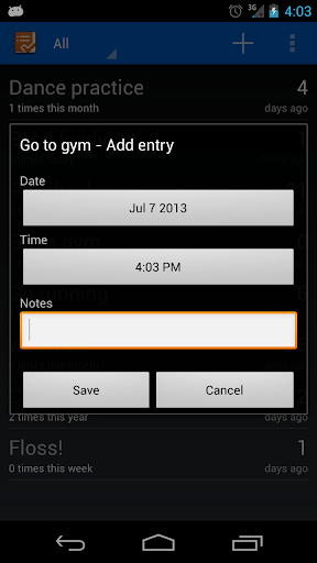 The intuitive user interface makes it very easy to get started. You can create new activities, quickly add new entries, and see all past entries for an activity.
