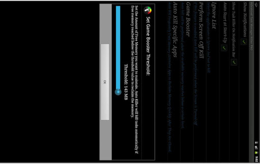 Game Booster Mode: Boost your game performance by killing other background processes when your game is running. Select the amount of free memory you want to maintain and then select the game to boost the performance. Advanced task killer will maintain this free memory for you by killing other background tasks.