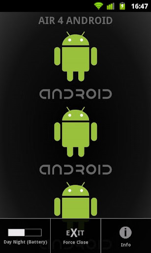 Features: Android System look alike Menu (emulation), Stage orientation landscape and portrait support (with 3D transition), (auto)fits any screen resolution (optimized for 800x480 and up - tablet), force close of app, store user settings as 'SharedObject', info popUp (emulation) ... night (eye and battery friendly) and day mode (black and white)