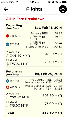 使用全新的 AirAsia 行動應用程式,輕鬆預訂航班及辦理登機。 簡單的格式設計,使預訂程序變得輕鬆容易。 您可以輕鬆挑選最低價格的全包航費 (ALL-IN-FARE)、輸入您的詳細資料以及確認您的訂位。
