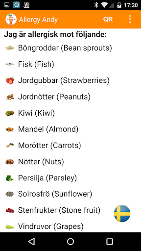 - Scan an Allergy Andy QR-code, if the restaurant is Allergy Andy certified, and get information about ingredienses in a dish and match you allergies (Create your own QR codes).