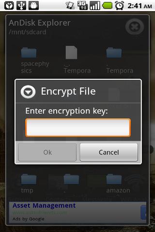 AnDisk is a graphical file system browser, with encryption support. Encrypt files or entire folders. From the file browser a user can launch or send files, rename, delete, copy, and create folders.