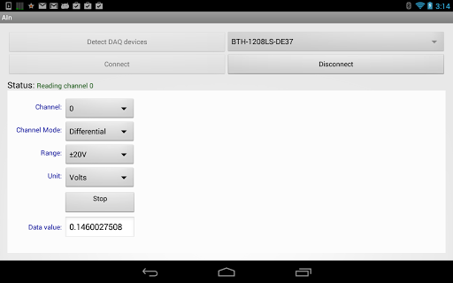 The Analog Input app demonstrates the use of the Universal Library for Android™ API to acquire analog data from a Measurement Computing (MCC) data acquisition device (USB, Bluetooth or Ethernet).