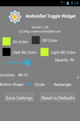 * 1x1 widget (long-press to select from widget menu) to turn on and off popular toggles