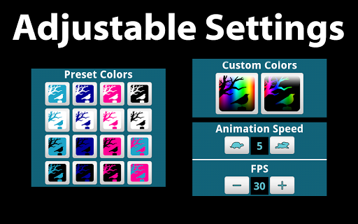 Customize the colors by choosing from presets or by picking your own custom colors. Decide which of the ten scenes are displayed and whether they shuffle or play in order. Slow down or speed up the animations and adjust the frames per second to save battery life.