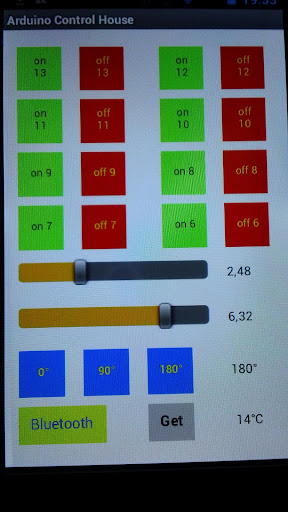 Usando el Bluetooth del Teléfono se conecta al Arduino, Realiza el control de 8 Puertos Digitales, 2 Dimer por PWM, control de Sevomotor y Lectura de puerto analógico.