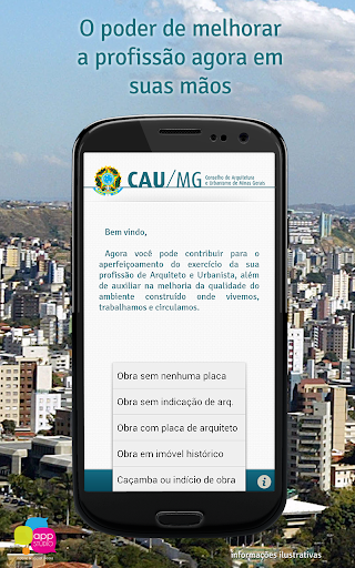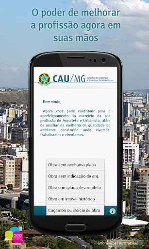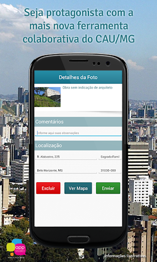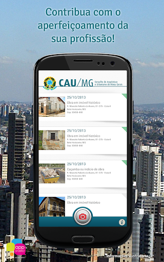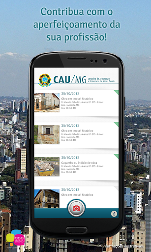 Por meio de processo prático e intuitivo, utilizando recursos de geolocalização e a câmera do smartphone, cada profissional poderá contribuir efetivamente para o aperfeiçoamento de sua própria atividade, através do registro de informações de obra sem placa, placa sem indicação de arquiteto, obra em imóvel histórico, caçamba ou indício de obra em todo o estado de Minas Gerais.