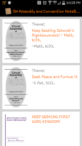 This app is for taking notes during the Special Day and Circuit Assembly and the Regional Convention of Jehovah's Witnesses. The app contains the program schedules for the 2015 season in English, Spanish, and Italian.