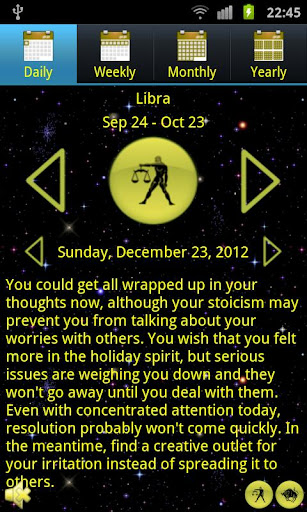 - Daily horoscope (Yesterday, Today, Tomorrow)