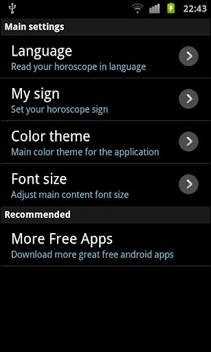 To change color theme (green, red, blue, yellow) or font size (small, normal, large) run app, wait main screen with all 12 horoscope signs and press button Menu -> Options -> Settings.