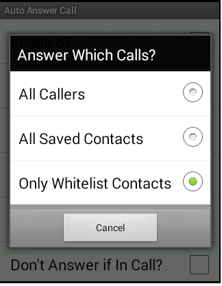 Option for Select Answer for which calls Automatically like All Callers ,Caller Which are my Contacts Or Callers which are White-listed or starred.