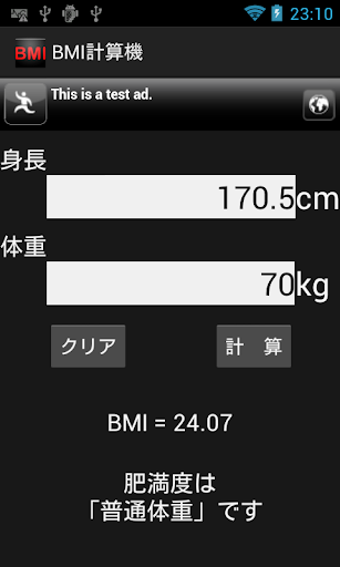 肥満度を表すBMI(Body Mass Index:ボディマス指数)を算出するアプリです。