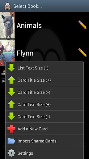 - Share books and cards with friends and family via email and bluetooth (press and hold on item in book list or card list)