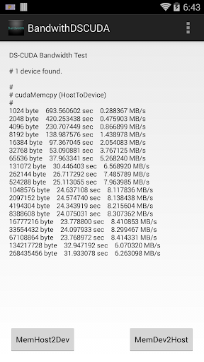 This app measures the bandwidth between Client (Android Device) and Server (Linux DS-CUDA) using memcpyD2H and memcpyH2D CUDA API.