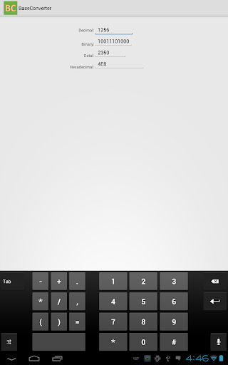 Number base converter, supporting conversion between binary, decimal, hexadecimal and octal. Just enter 1 of the base and all other bases would be displayed.