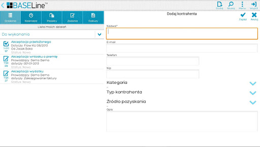 Baseline™ to więcej niż CRM. To dojrzałe i w pełni funkcjonalne rozwiązanie online dedykowane dla biznesu. Stanowi część rozbudowanej platformy Baseline™ służącej do zarządzania firmą na wielu płaszczyznach. Wersja mobilna Baseline™ wspiera takie obszary działania firmy jak: