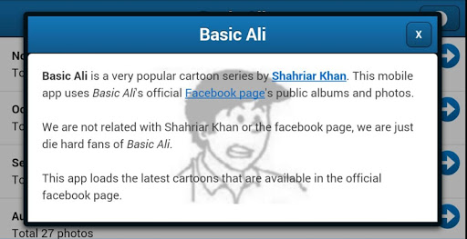 Basic Ali is a very popular cartoon series by Shahriar Khan. This mobile app uses Basic Ali's official Facebook page's public albums and photos. We are not related with Shahriar Khan or the facebook page, we are just die hard fans of Basic Ali. This app loads the latest cartoons that are available in the official facebook page.