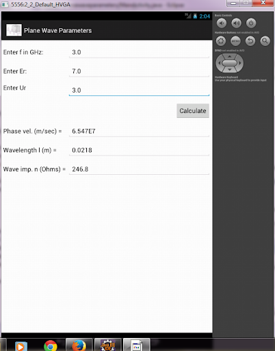 User enters frequency in GHz, Er & Ur, pushes the "Calculate" button and this app calculates phase velocity, wavelength and impedance. As an example, enter 3 for GHz, 7 for Er and 3 for Ur, then push calculate. This should result in 6.547E7 m/sec for the phase velocity, 0.0218 m for the wavelength and 246.9 Ohms for the impedance.