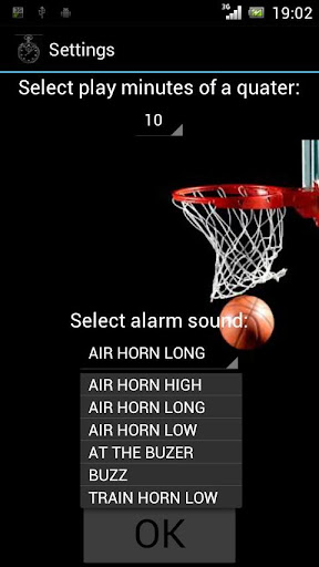 In the settings menu you can select how many minutes you want to play in a quater and you can select from several built in sounds.
