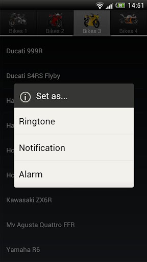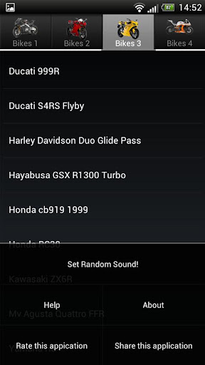 A must have for any bike fans... Do you love the sounds of bikes at full throttle or just a rumbling idle? This application lets you listen to over 40 of best bikes money can buy.