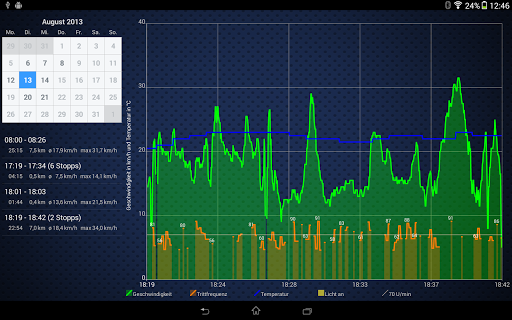Extrem genaue Geschwindigkeitsermittlung durch 30 Impulse pro Umdrehung des Nabendynamos. Dies ermöglicht die Berechnung der Trittfrequenz (experimentell). Aufgezeichnet werden Geschwindigkeit, Trittfrequenz, Temperatur, Fahrtzeit, Distanz, Datum und Uhrzeit deiner Fahrten.