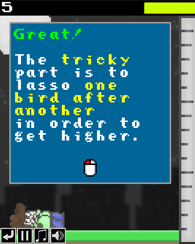 Bird Cowboy is a game that draws on old school arcade games and combines them with modern physics and game dynamics. Try to get as many points as possible and get as high into the sky as possible! The ingame tutorial is recommended for all new players.